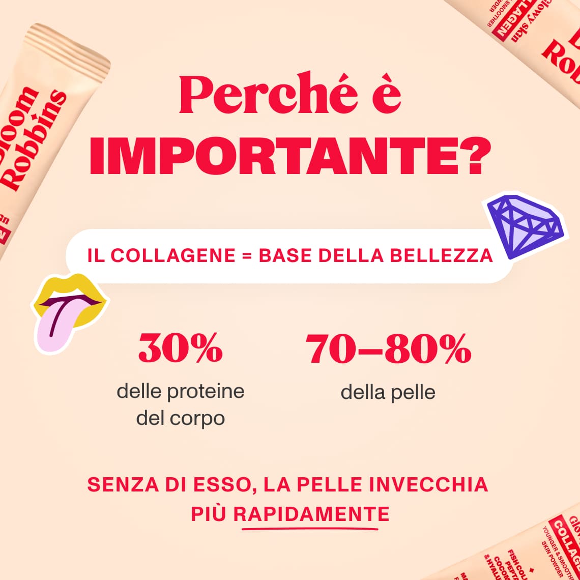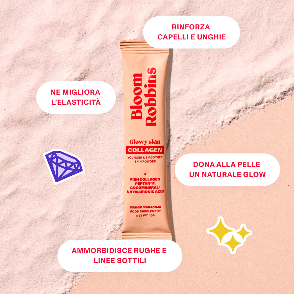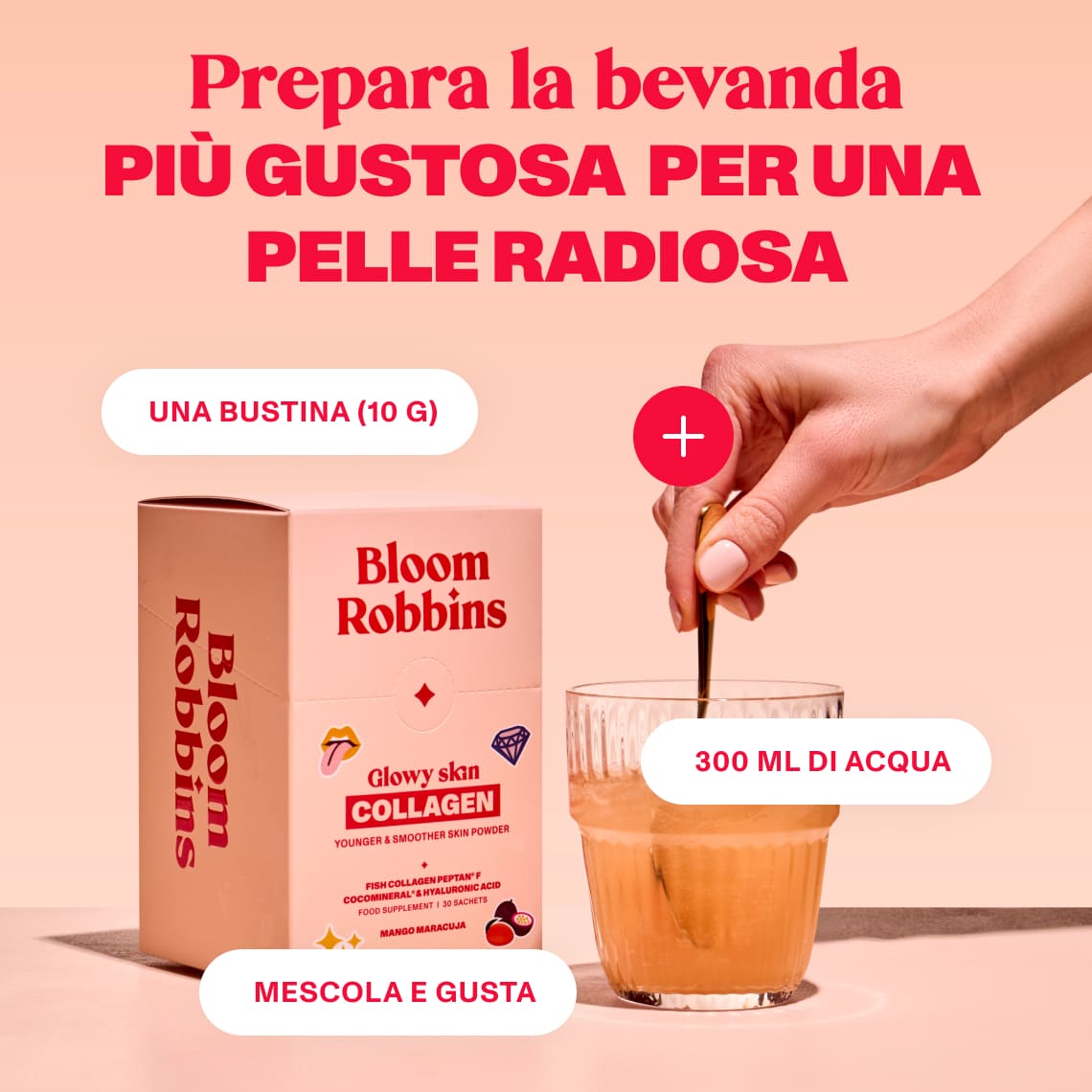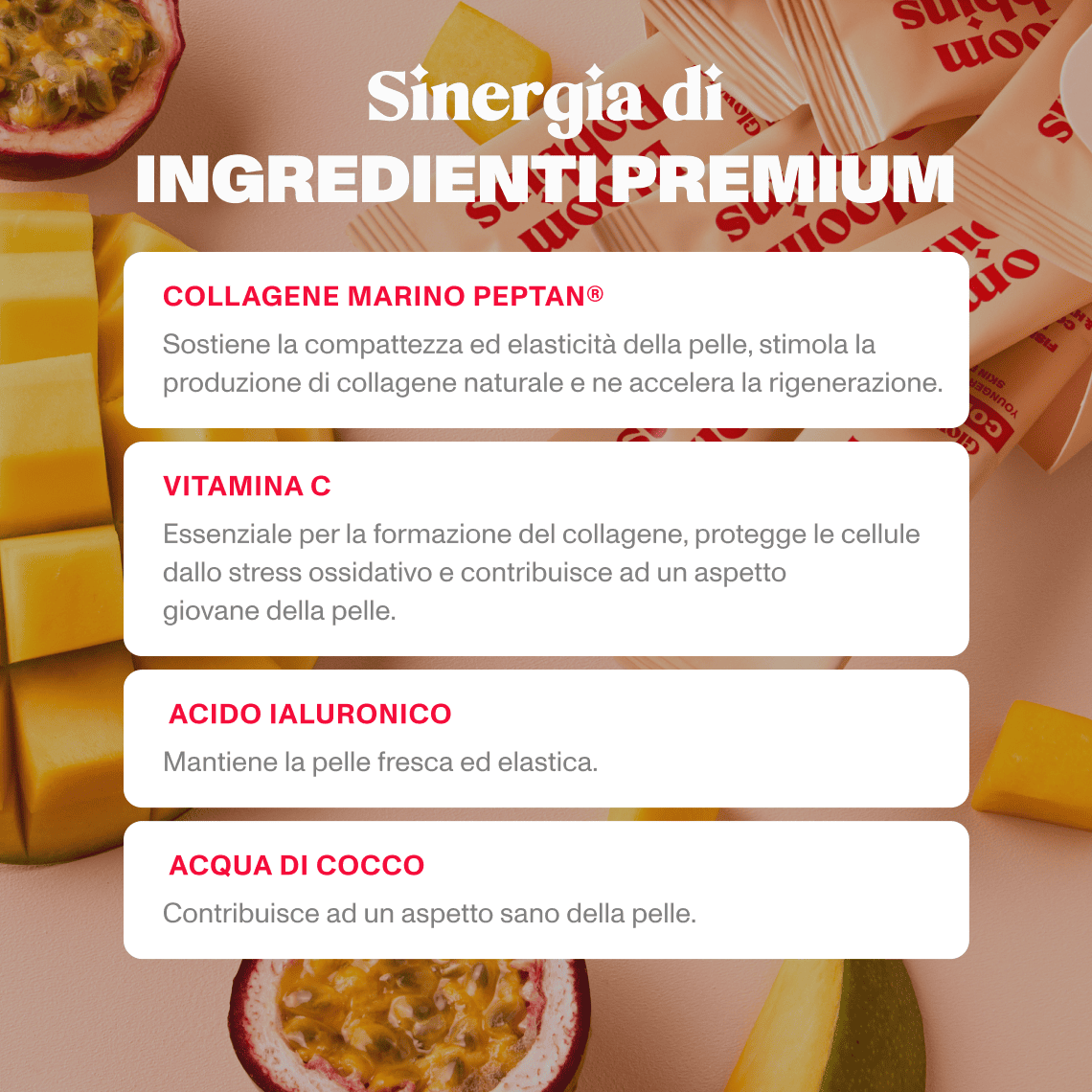 Fish collagen peptides Peptan®, acidity regulator (citric acid), inulin, coconut water powder CocoMineral®, flavouring, sodium hyaluronate, vitamin C (L-ascorbic acid), beetroot concentrate, sweetener (sucralose)