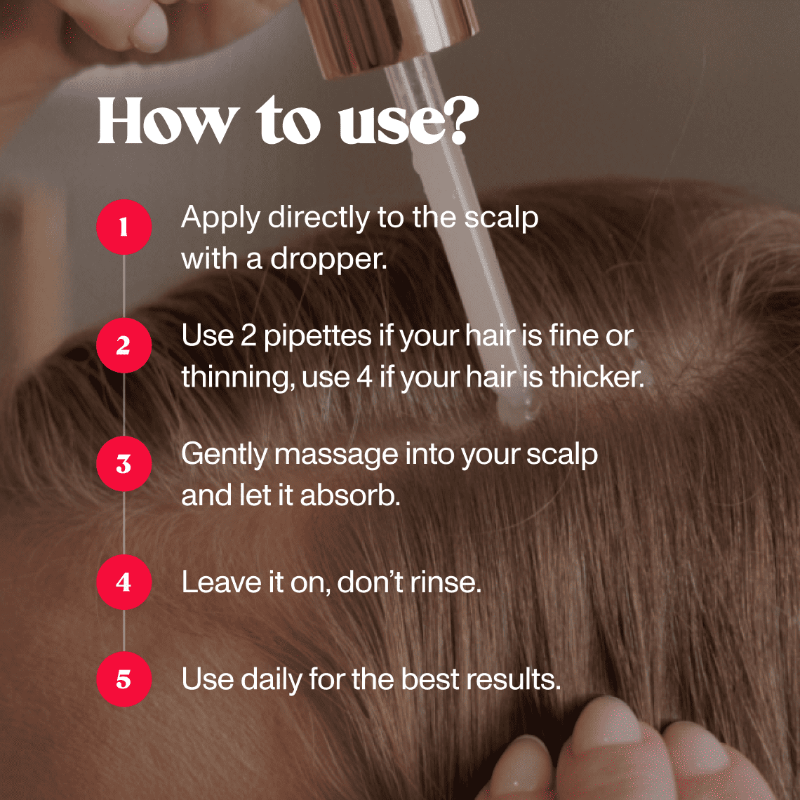 Prelevare il siero per capelli con un contagocce e distribuirlo uniformemente sul cuoio capelluto. La quantità di siero dipende dal tipo di capello. Idealmente, utilizzare 2 contagocce per capelli fini e 4 contagocce per capelli spessi. Massaggiare sul cuoio capelluto con movimenti circolari. Il prodotto è leggero e non grasso, rendendolo adatto all'uso quotidiano. Non è necessario risciacquare il siero dopo l'applicazione.